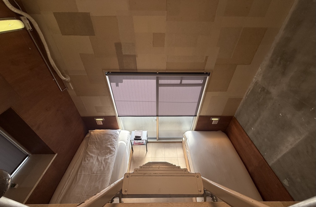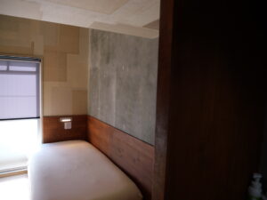 壁天井仕上げは和紙 床はパーチの上、フロアタイル 構造用合板作成したオリジナルベット